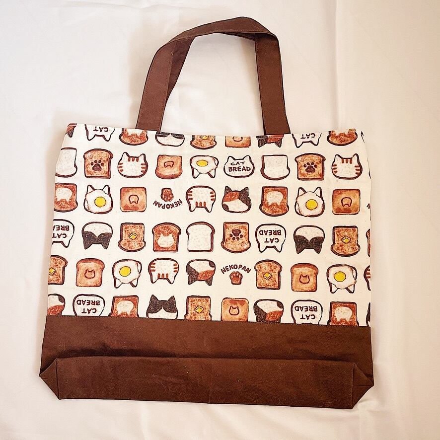 猫の生地で作られたトートバッグ。裏地もついているしっかりとしたバッグです。内側にはポケットがついています。